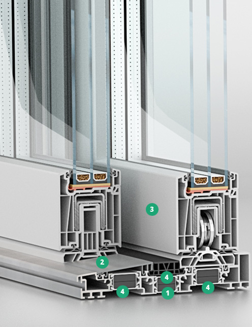 Avec le système Schüco Thermoslide, qui se caractérisé par une excellente isolation thermique, il est possible de mettre le vitrage jusqu’à 52 mm. Il est destiné aux maisons passives (Uw ≤ 0,8 W/m²K).